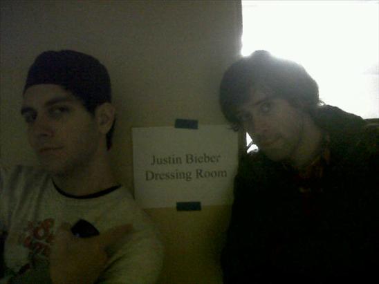 2 kép Ryland Blackinton (gitáros) és Gabe Saporta (énekes)..Az első kép az személyes.Gabe Saportaval melette ül Justin autogramosztásnál..A második képnél a zenekar gitárosa Ryland Blackinton,mellette Gabe Saporta. A fotón, van egy papír amire az van ráírva "Justin Bieber öltözője",